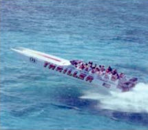 Anyway, if you ever get down to the Bahamas, take a ride on the Thriller. Leave any loose articles of clothing at home (your Hilfiger cap will be history inside of a minute), and prepare for a ride you won’t soon forget. But wait for a rough day at sea: although we did get airborne off the wake of a fishing boat, the seas were perhaps too smooth on the day I took my ride. The trip was exhilaratingly fast, yet relatively undramatic.
